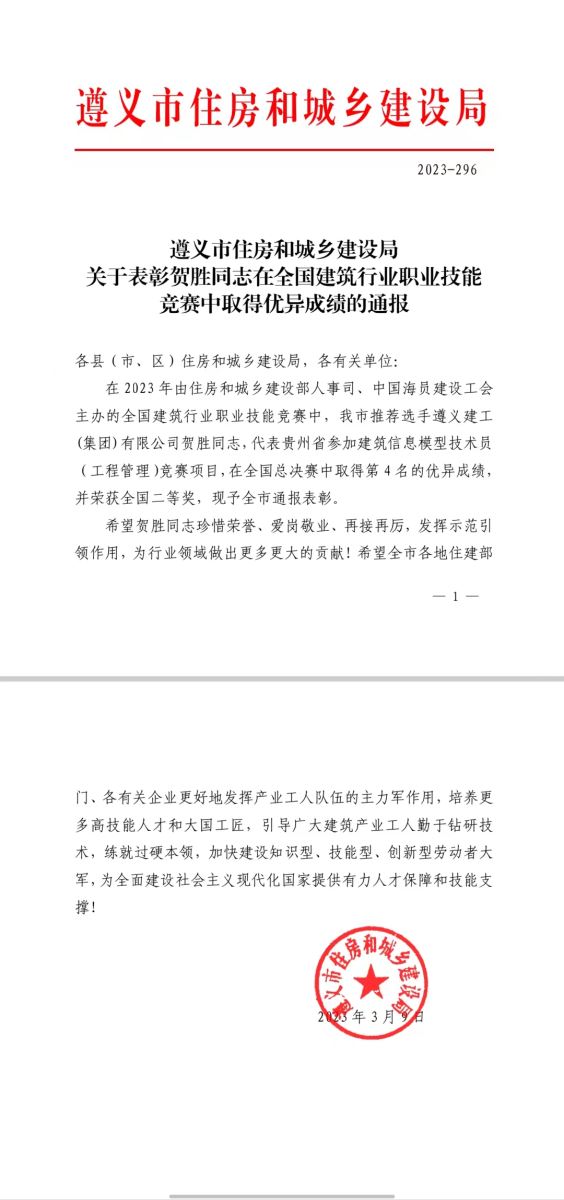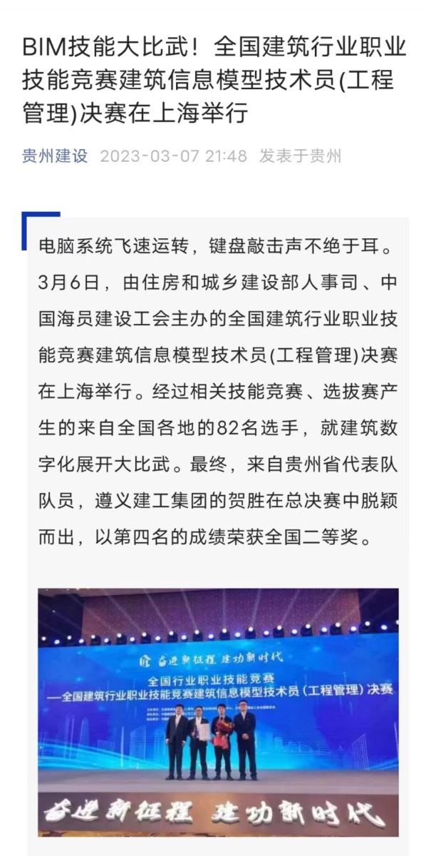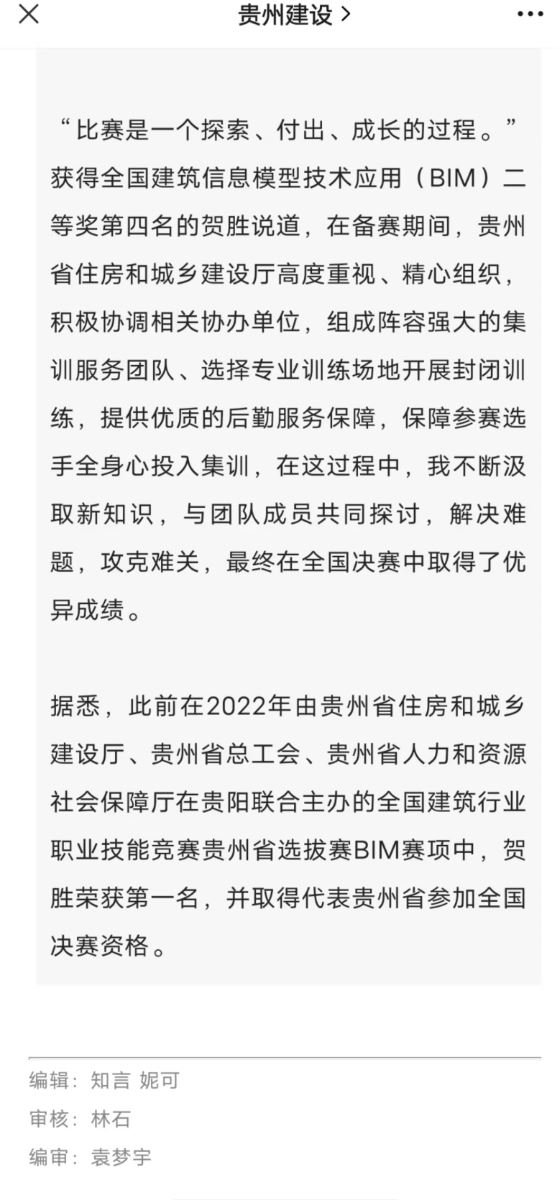 此前,在2022年11月由貴州省住房和城鄉(xiāng)建設(shè)廳、貴州省總工會、貴州省人力資源和社會保障廳聯(lián)合舉辦的全國建筑行業(yè)職業(yè)技能競賽貴州省選拔賽中,賀勝就取得了第一名的優(yōu)異成績,被授予“全省住房城鄉(xiāng)建設(shè)系統(tǒng)貴州建設(shè)工匠”榮譽(yù)稱號。此次是代表貴州省在全國決賽中參與角逐。